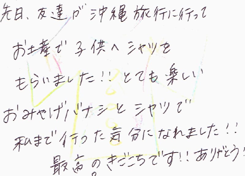 先日、友達が沖縄旅行に行ってお土産で子供へシャツをもらいました!!とても楽しいおみやげバナシとシャツで私まで行った気分になれました!!最高のきごこちです!!ありがとう!