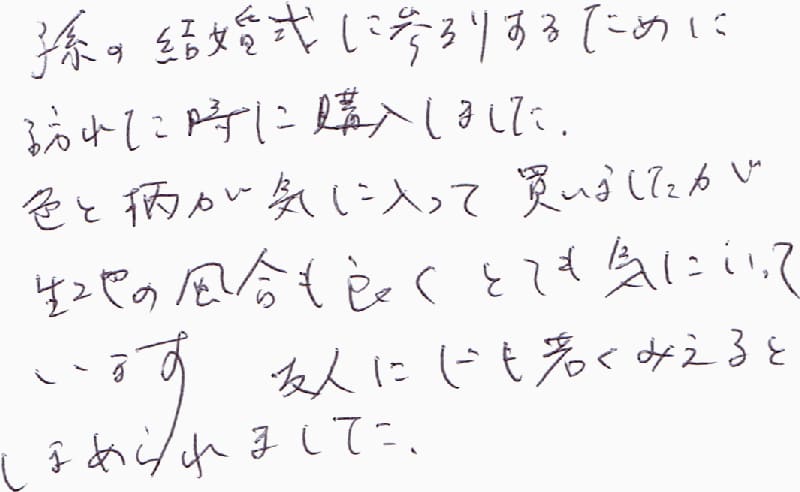孫の結婚式に参列するために訪れた時に購入しました。色と柄が気に入って買いましたが生地の風合も良くとても気にいっています。友人にも若くみえるとほめられました。