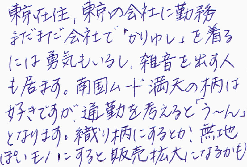 東京在住、東京の会社に勤務 まだまだ会社で「かりゆし」を着るには勇気もいるし、雑音を出す人も居ます。南国ムード満天の柄は好きですが、通勤を考えると「うーん」となります。織り柄にするとか、無地ぽいモノにすると販売拡大になるかもと思います。