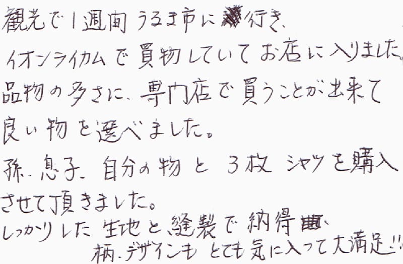 観光で1週間うるま市に行き、イオンライカムで買物していてお店に入りました。品物の多さに、専門店で買うことが出来て良い物を選べました。孫、息子、自分の物と3枚シャツを購入させて頂きました。しっかりした生地と縫製で納得、柄、デザインもとても気に入って大満足!!