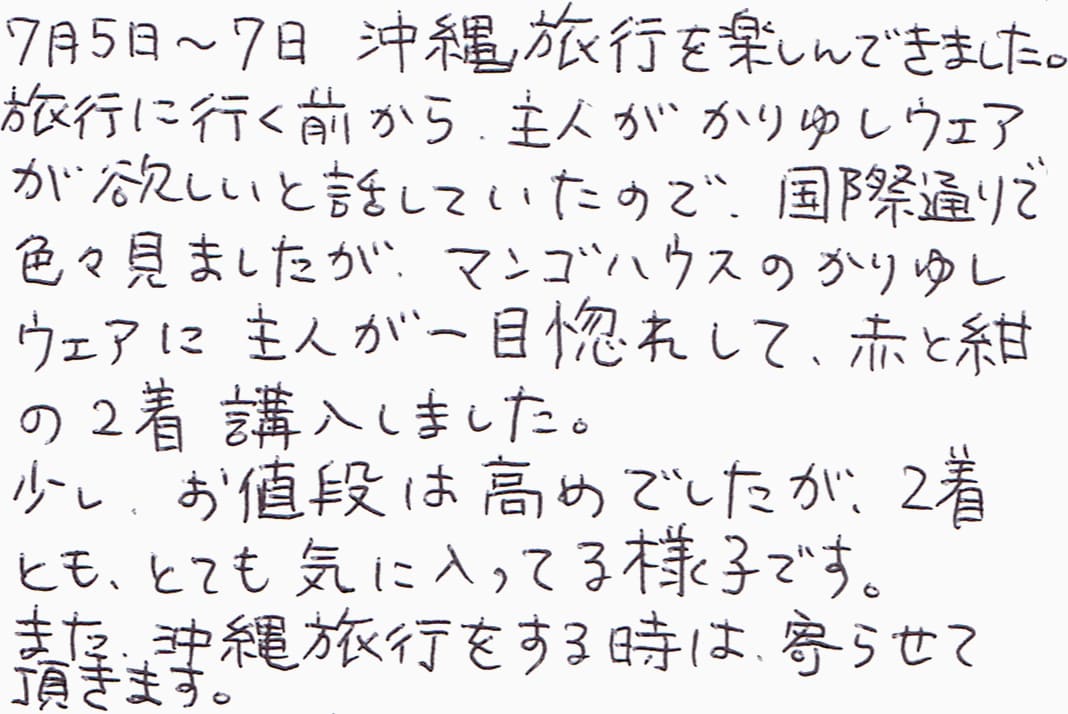 7月5日~7日 沖縄旅行を楽しんできました。旅行に行く前から、主人がかりゆしウェアが欲しいと話していたので、国際通りで色々見ましたが、マンゴハウスのかりゆしウェアに主人が一目惚れして、赤と紺の2着購入しました。少し、お値段は高めでしたが、2着とも、とても気に入ってる様子です。また、沖縄旅行をする時は、寄らせて頂きます。