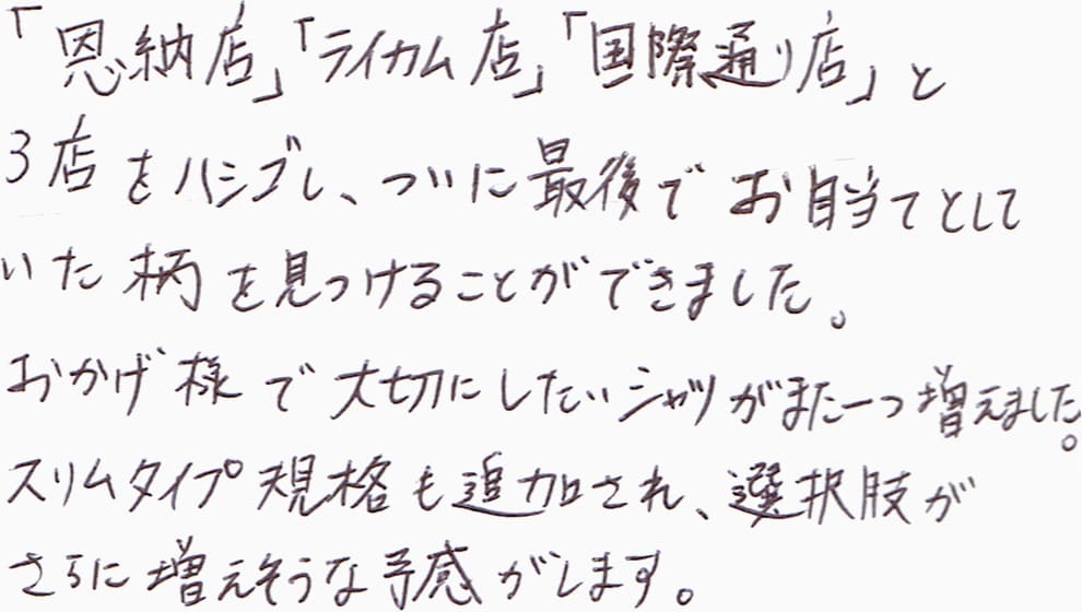 「恩納店」「ライカム店」「国際通り店」と3店をハシゴし、ついに最後でお目当てとしていた柄を見つけることができました。おかげ様で大切にしたいシャツがまた一つ増えました。スリムタイプ規格も追加され選択肢がさらに増えそうな予感がします。