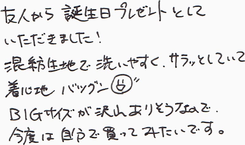 友人から誕生日プレゼントとしていただきました!混紡生地で洗いやすく、サラッとしていて着心地バツグン。BIGサイズが沢山ありそうなので、今度は自分で買ってみたいです。