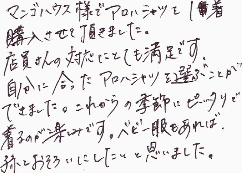 マンゴハウス様でアロハシャツを1着購入させて頂きました。店員さんの対応にとても満足です。自分に合ったアロハシャツを選ぶことができました。これからの季節にピッタリで着るのが楽しみです。ベビー服もあれば、孫とおそろいにしたいと思いました。