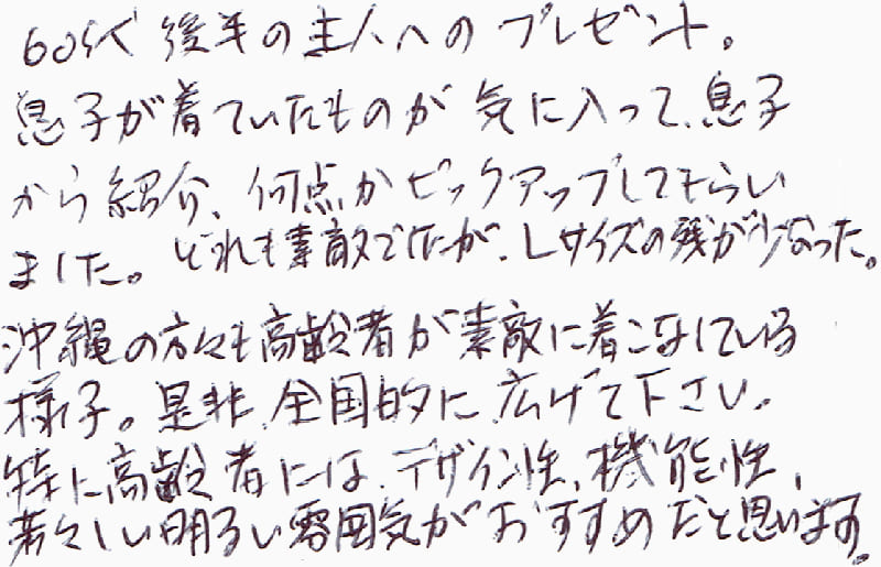 60代後半の主人へのプレゼント。息子が着ていたものが気に入って、息子から紹介、何点かピックアップしてもらいました。どれも素敵でしたが、Lサイズの残が少なかった。沖縄の方々も高齢者が素敵に着こなしている様子。是非、全国的に広げて下さい。特に高齢者には、デザイン性、機能性、若々しい明るい雰囲気がおすすめだと思います。