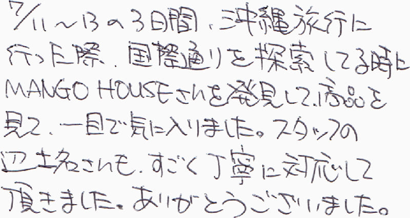 3年ぶりの沖縄旅行、恩納ムーンビーチ前店に、6/28の閉店間際に行きました。20時過ぎていたのに、とても丁寧に対応してもらい、感激しました。ますますマンゴハウスさんが好きになりました。また沖縄行きたい!!