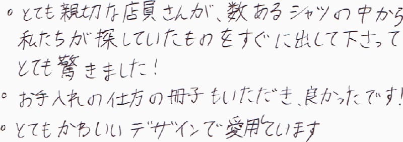 数あるシャツの中から私たちが探していたものをすぐに出して下さってとても驚きました!