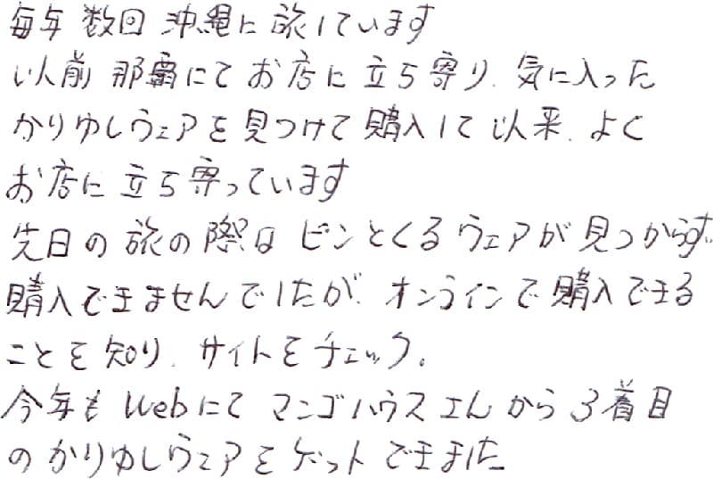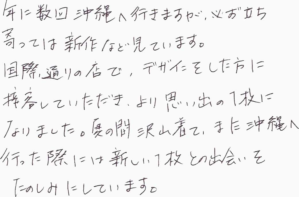 年に数回沖縄へ行きますが、必ず立ち寄っては新作など見ています。国際通りの店で、デザインをした方に接客していただき、より思い出の1枚になりました。夏の間沢山着て、また沖縄へ行った際には新しい1枚との出会いをたのしみにしています。