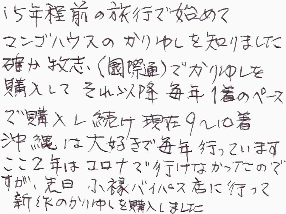15年程前の旅行で始めてマンゴハウスのかりゆしを知りました。確か牧志(国際通)でかりゆしを購入してそれ以降毎年1着のペースで購入し続け現在9~10着。沖縄は大好きで毎年行っています。ここ2年はコロナで行けなかったのですが、先日小禄バイパス店に行って新作のかりゆしを購入しました。