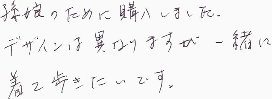 孫娘のために購入しました。デザインは異なりますが一緒に着て歩きたいです。