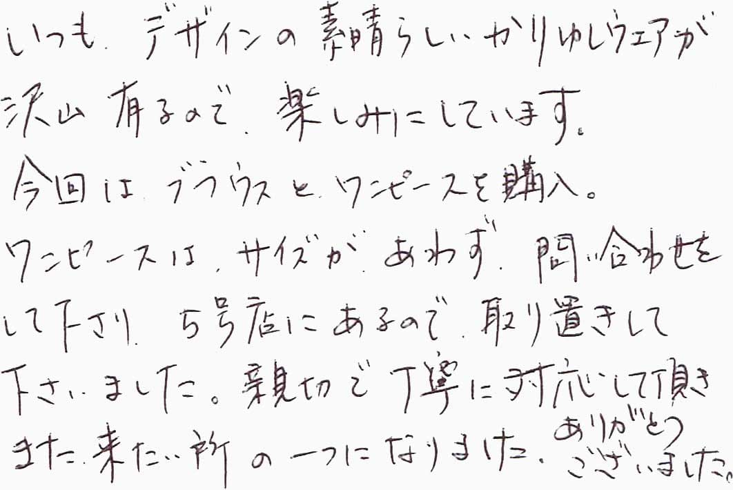 いつも、デザインの素晴らしいかりゆしウェアが沢山有るので、楽しみにしています。今回はブラウスとワンピースを購入。ワンピースはサイズがあわず、問い合わせをして下さり、5号店にあるので、取り置きして下さいました。親切で丁寧に対応して頂き、また来たい所の一つになりました。ありがとうございました。