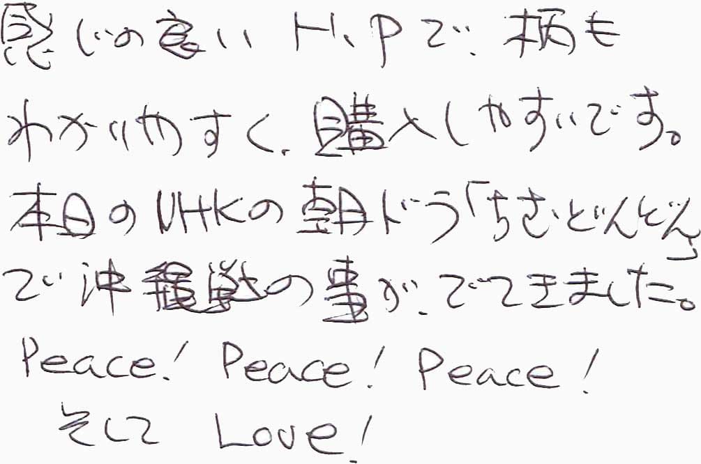 感じの良いHPで、柄もわかりやすく、購入しやすいです。本日もNHKの朝ドラ「ちむどんどん」で沖縄戦の事が、でてきました。Peace!Peace!Peace!そしてLove!