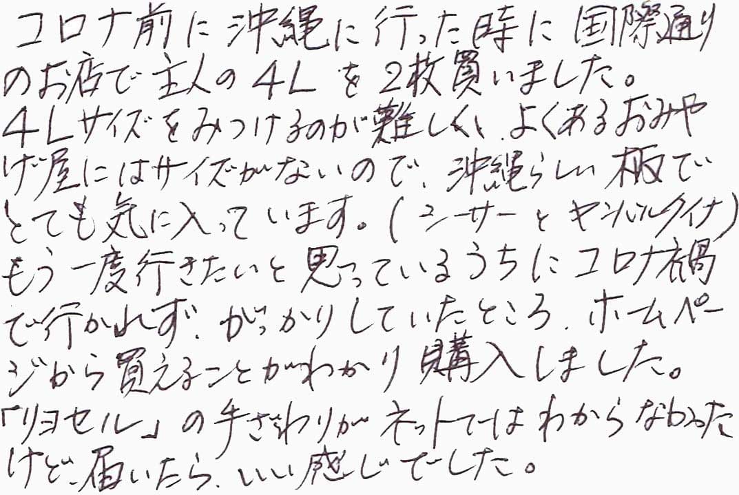 コロナ前に沖縄に行った時に国際通りのお店で主人の4Lを2枚買いました。4Lサイズをみつけるのが難しく、よくあるおみやげ屋にはサイズがないので、沖縄らしい柄でとても気に入っています。(シーサーとヤンバルクイナ)もう一度行きたいと思ってるうちにコロナ禍で行かれず、がっかりしていたところ、ホームページから買えることがわかり購入しました。「リヨセル」の手ざわりがネットではわからなかったけど、届いたら、いい感じでした。