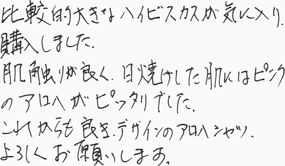 比較的大きなハイビスカスが気に入り、購入しました。肌触りが良く、日焼けした肌はピンクのアロハがピッタリでした。これからも良きデザインのアロハシャツ、よろしくお願いします。