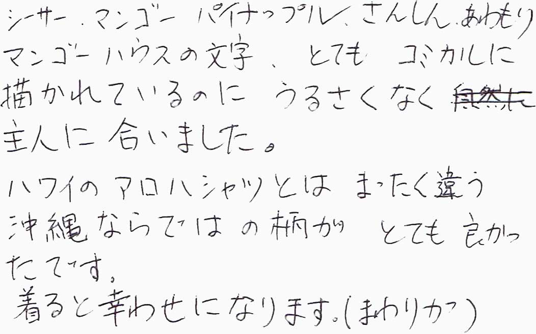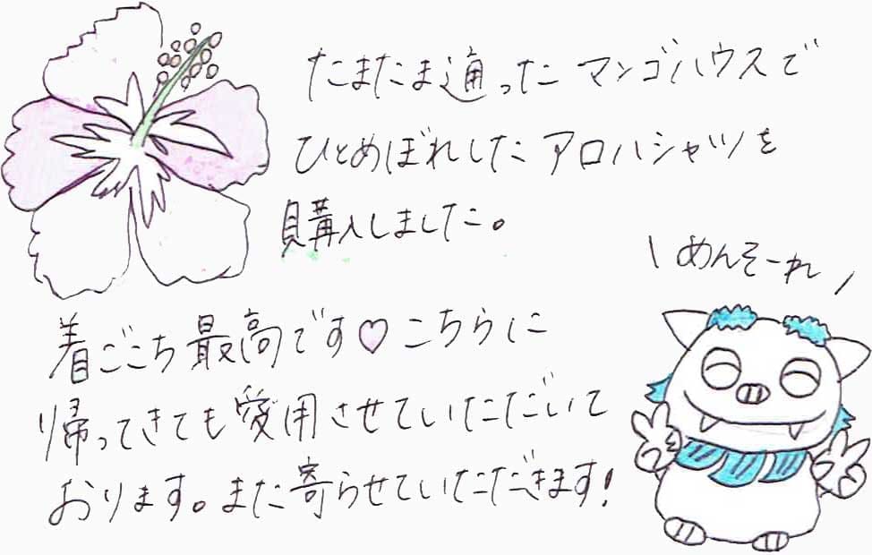 たまたま通ったマンゴハウスでひとめぼれしたアロハシャツを購入しました。着ごこち最高です。こちらに帰ってきても愛用させていただいております。また寄らせていただきます!