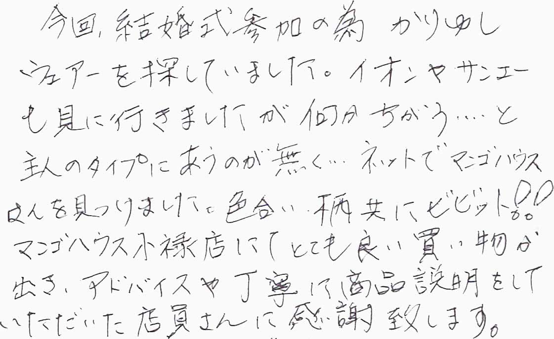 今回、結婚式参加の為かりゆしウェア―を探していました。イオンやサンエーも見に行きましたが何か違う…と、主人のタイプにあうのが無く…ネットでマンゴハウスさんを見つけました。色合い、柄共にビビット!!マンゴハウス小禄店にてとても良い買い物が出き、アドバイスや丁寧に商品説明をしていただいた店員さんに感謝致します。