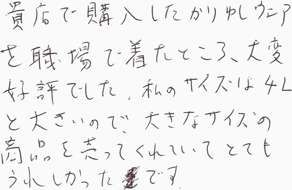 貴店で購入したかりゆしウェアを職場で着たところ、大変好評でした。私のサイズ4Lと大きいので、大きなサイズの商品を売ってくてていてとてもうれしかったです。