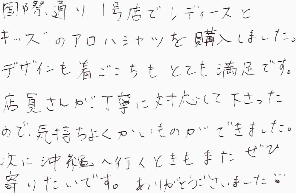 国際通り1号店でレディースとキッズのアロハシャツを購入しました。デザインも着ごこちもとても満足です。店員さんが、丁寧に対応して下さったので、気持ちよくかいものができました。次に沖縄へ行くときもまたぜひ寄りたいです。ありがとうございました。