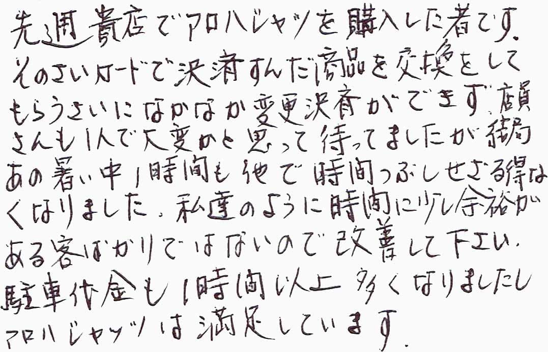 先週貴店でアロハシャツを購入した者です。そのさいカードで決済すんだ商品を交換をしてもらうさいになかなか変更決済ができず、店員さんも1人で大変かと思って待ってましたが、結局あの暑い中1時間も他で時間つぶしせざる得なくなりました。私達のように時間に少し余裕がある客ばかりではないので改善して下さい。駐車代金も1時間以上多くなりましたし。アロハシャツは満足しています。