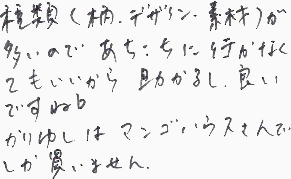 種類(柄、デザイン、素材)が多いのであちこちに行かなくてもいいから助かるし、良いですね。かりゆしはマンゴハウスさんでしか買いません。