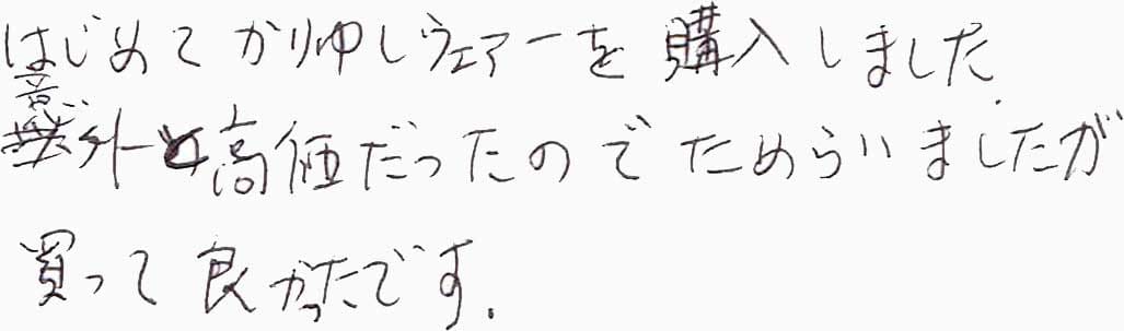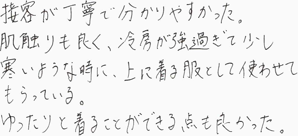 接客が丁寧で分かりやすかった。肌触りも良く、冷房が強過ぎて少し寒いような時に、上に着る服として使わせてもらっている。ゆったりと着ることができる点も良かった。