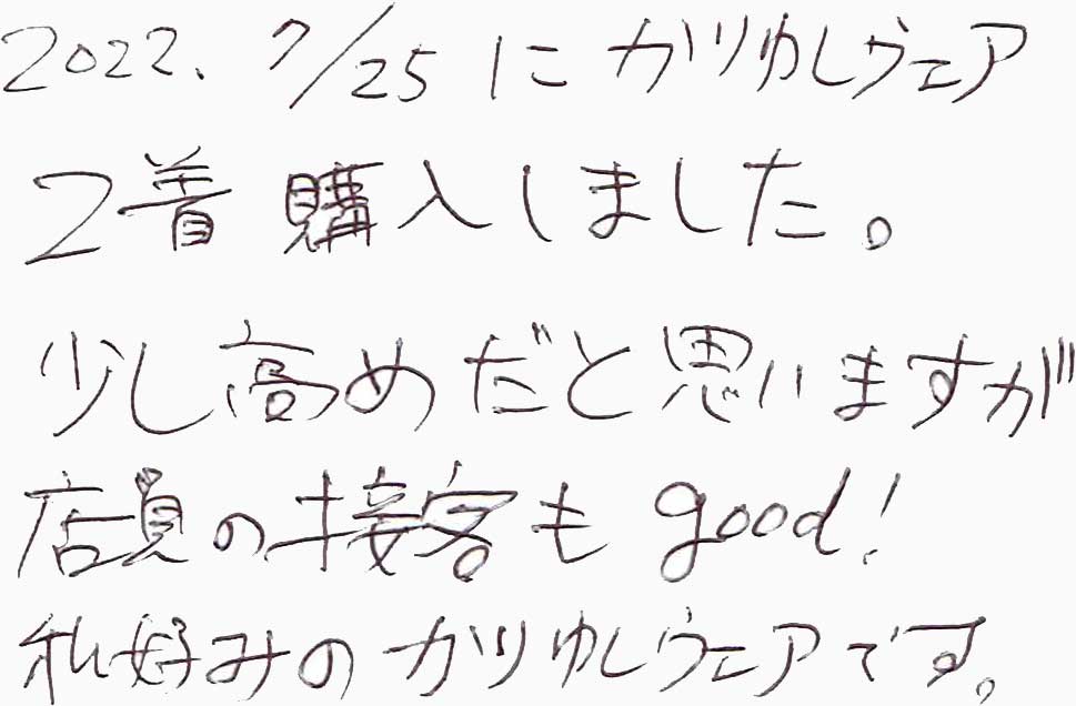 2022.7/25にかりゆしウェア2着購入しました。少し高めだと思いますが店員の接客もgood!私好みのかりゆしウェアです。