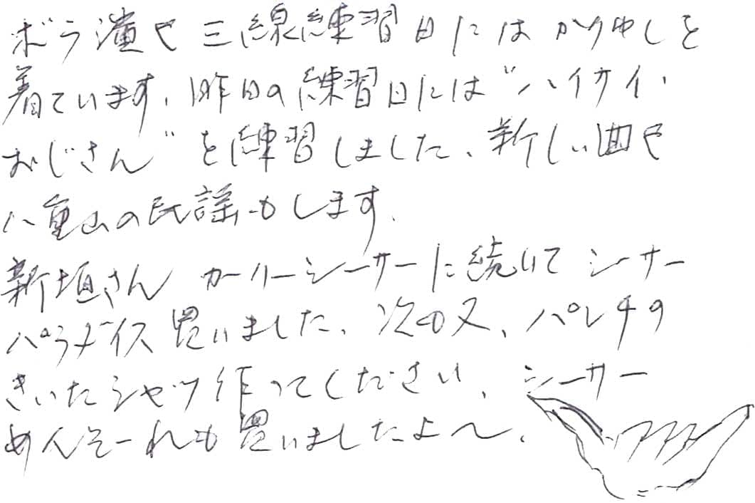 ボラ演や三線練習日にはかりゆしを着ています。昨日の練習日には“ハイサイおじさん”を練習しました。新しい曲や八重山の民謡もします。新垣さんカーリーシーサーに続いてシーサーパラダイス買いました。次も又、パンチのきいたシャツ作ってください。シーサーめんそーれも買いましたよ~。