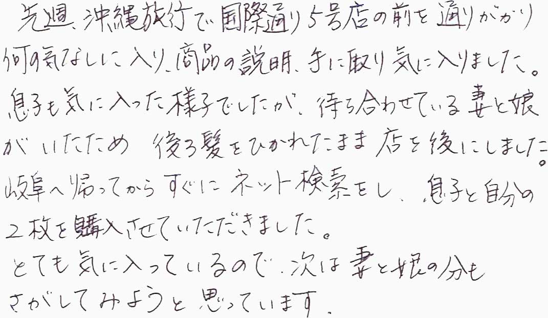 先週、沖縄旅行で国際通り5号店の前を通りがかり、何の気なしに入り、商品の説明、手に取り気に入りました。息子も気に入った様子でしたが、待ち合わせている妻と娘がいたため後ろ髪をひかれたまま店を後にしました。岐阜へ帰ってからすぐにネット検索をし、息子と自分の2枚を購入させていただきました。とても気に入っているので、次は妻と娘の分もさがしてみようと思っています。