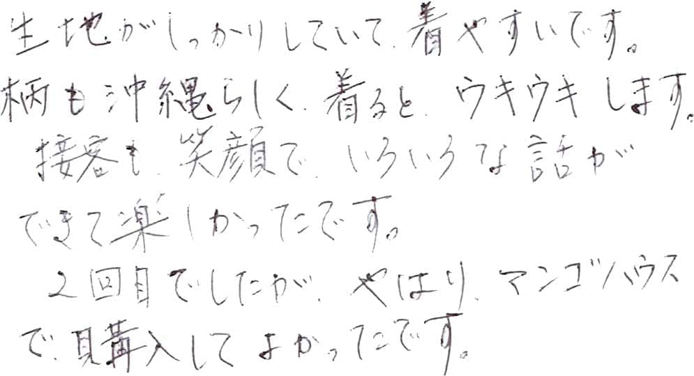 生地がしっかりしていて、着やすいです。柄も沖縄らしく、着ると、ウキウキします。接客も笑顔で、いろいろな話ができて楽しかったです。2回目でしたが、やはり、マンゴハウスで購入してよかったです。
