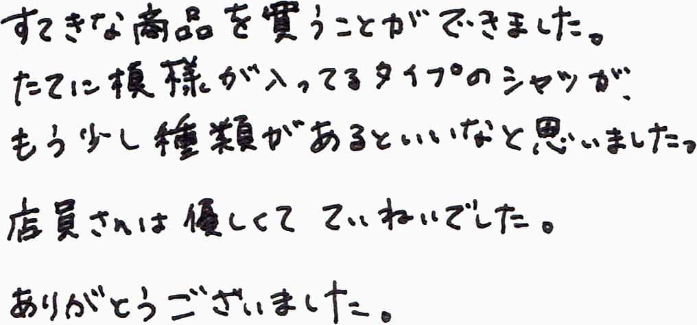 すてきな商品を買うことができました。たてに模様が入ってるタイプのシャツが、もう少し種類があるといいなと思いました。店員さんは優しくてていねいでしした。ありがとうございました。