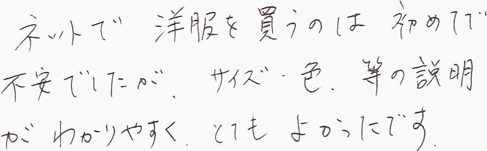 ネットで洋服を買うのは初めてで不安でしたが、サイズ・色、等の説明がわかりやすく、とてもよかったです。