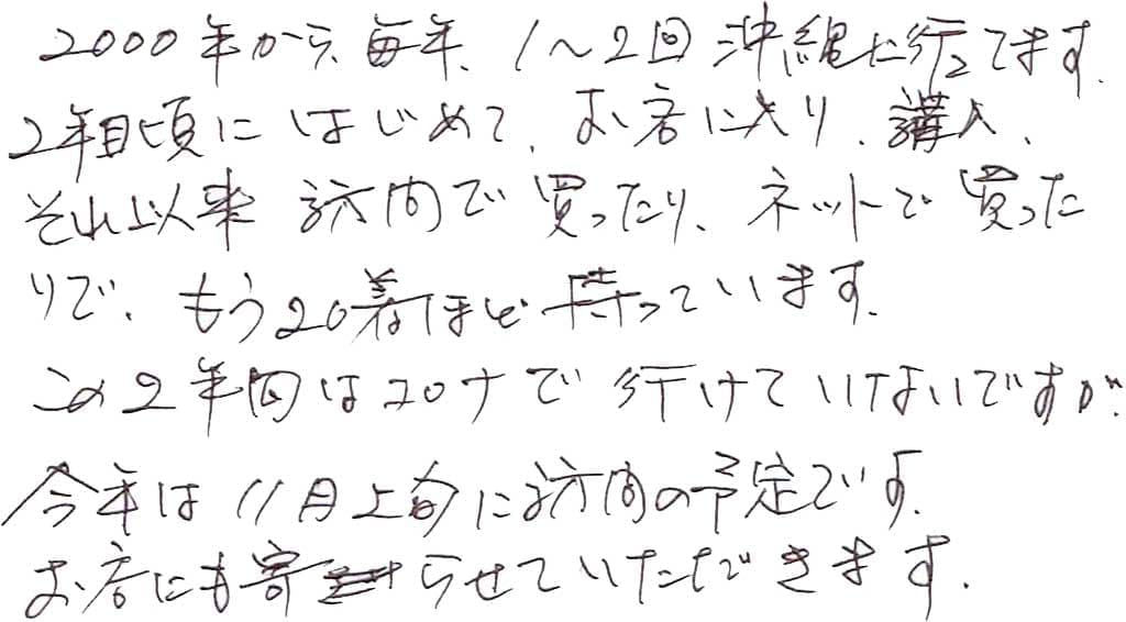 2000年から、毎年、1~2回沖縄に行ってます。2年目頃にはじめて。お店に入り、購入。それ以降訪問で買ったり、ネットで買ったりで、もう20着ほど持っています。この2年間はコロナで行けていないですが、今年は11月上旬に訪問の予定です。お店にも寄らせていただきます。