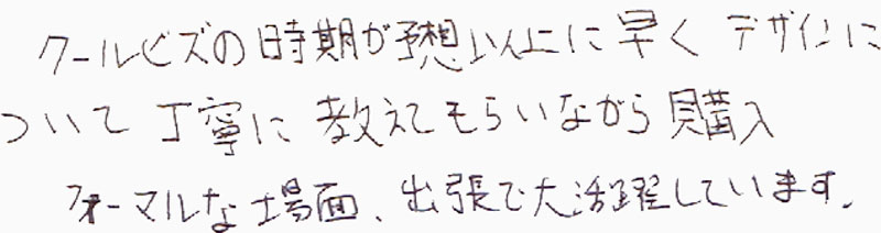 クールビズの時期が予想以上に早くデザインについて丁寧に教えててもらいながら購入 フォーマルな場面、出張で大活躍しています。