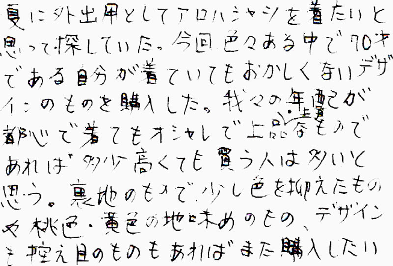 夏に外出用としてアロハシャツを着たいと思って探していた。今回、色々ある中で70才である自分が着ていておかしくないデザインのものを購入した。我々の年配が都心で着てもオシャレで上品・上質なものであれば多少高くても買う人は多いと思う。裏地のもので、少し色を抑えたものや桃色・黄色の地味めのもの、デザインも控え目のものもあればまた購入したい。