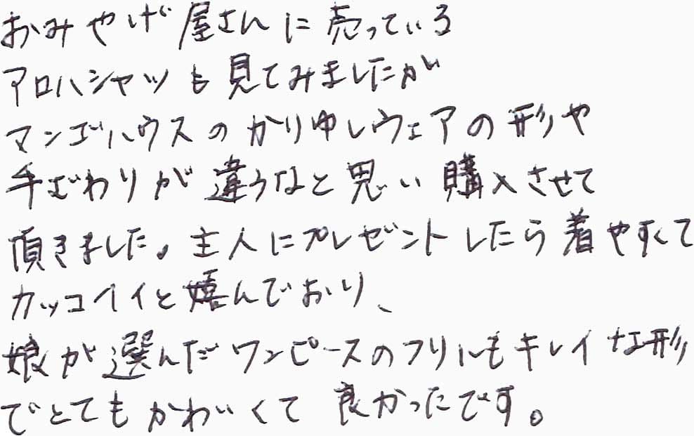 おみやげ屋さんに売っているアロハシャツも見てみましたがマンゴハウスのかりゆしウェアの形や手ざわりが違うなと思い購入させて頂きました。主人にプレゼントしたら着やすくてカッコイイと喜んでおり、娘が選んだワンピースのフリルもキレイな形でとてもかわいくて良かったです。