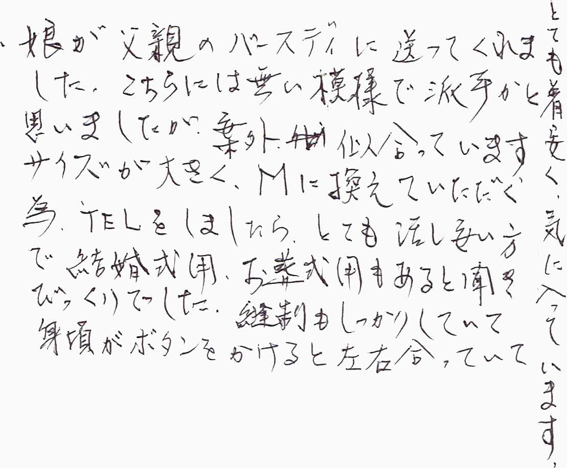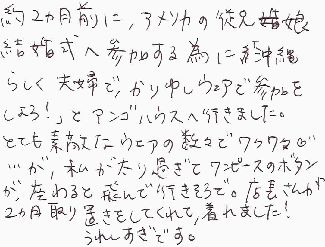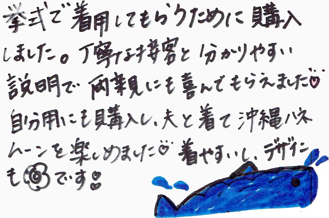 今回は、結婚式用の衣装としてかりゆしウェアを購入させていただきました。きんじょうさまをはじめとするスタッフの方々の温かいご対応と迅速な手配に大変感動し、普段なら書かないコメントをつい、書きたくなってしまいました・・・(笑)本当にありがとうございました!みなさま健康に気をつけておすごしください。