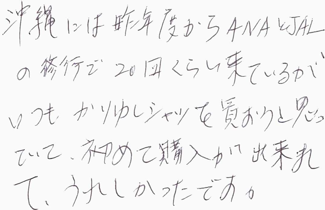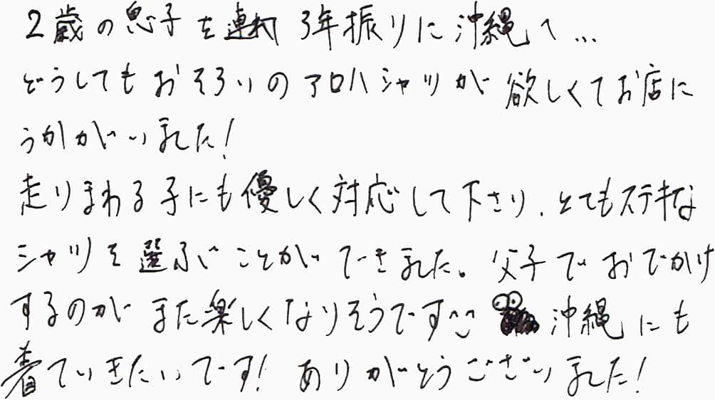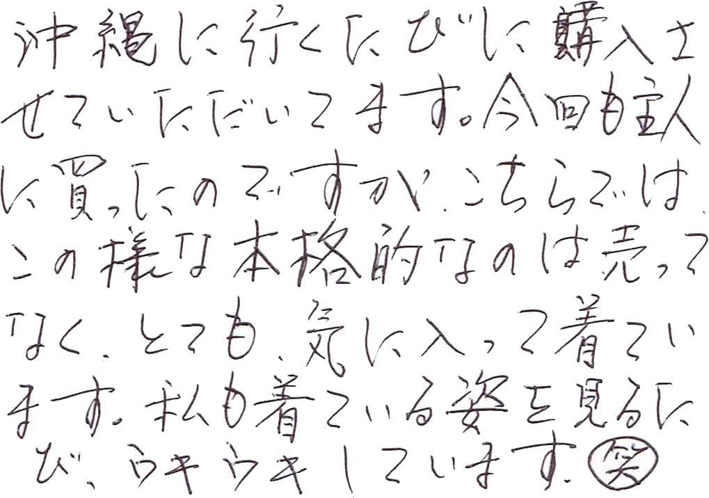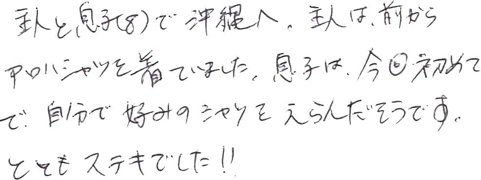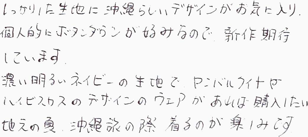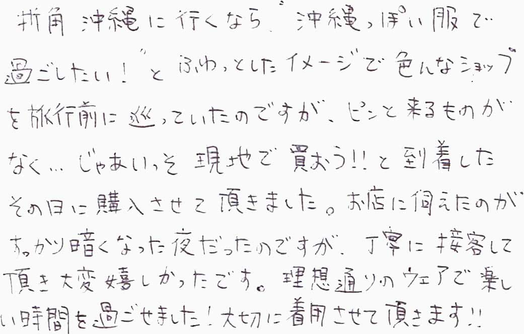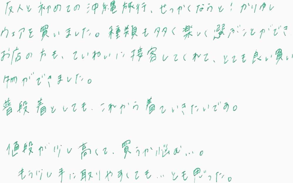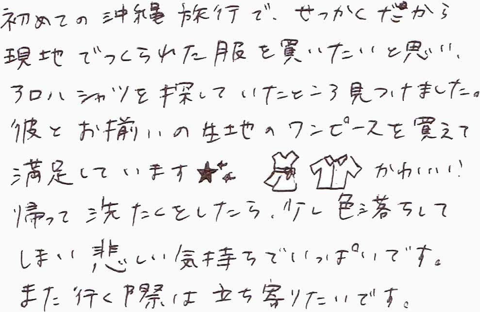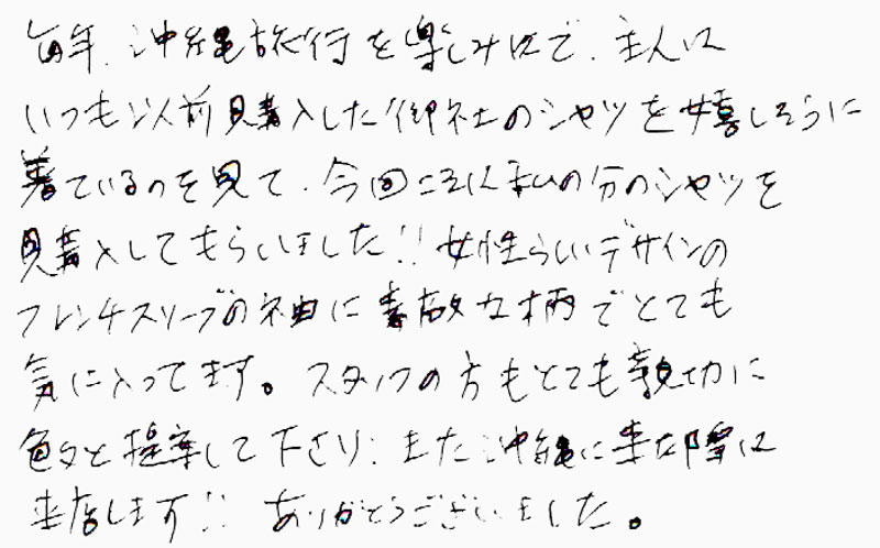 毎年、沖縄旅行を楽しみで、主人はいつも以前購入した御社のシャツを嬉しそうに着ているのを見て、今回こそは私の分のシャツを購入してもらいました!!女性らしいデザインのフレンチスリーブの袖に素敵な柄でとても気に入ってます。スタッフの方もとても親切に色々と提案して下さりまた沖縄に来た際は来店します!!ありがとうございました。