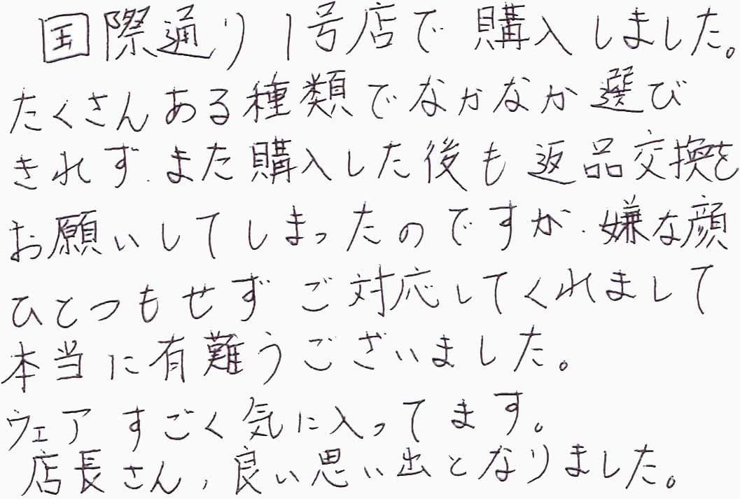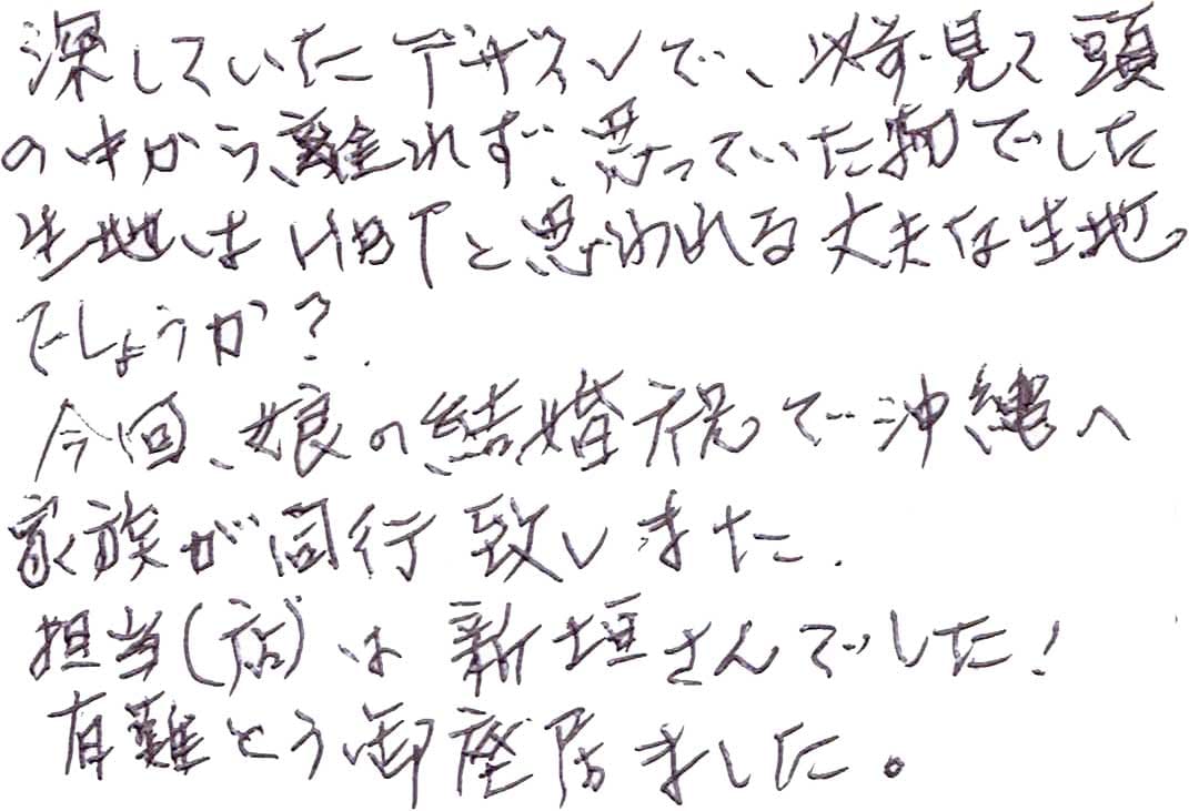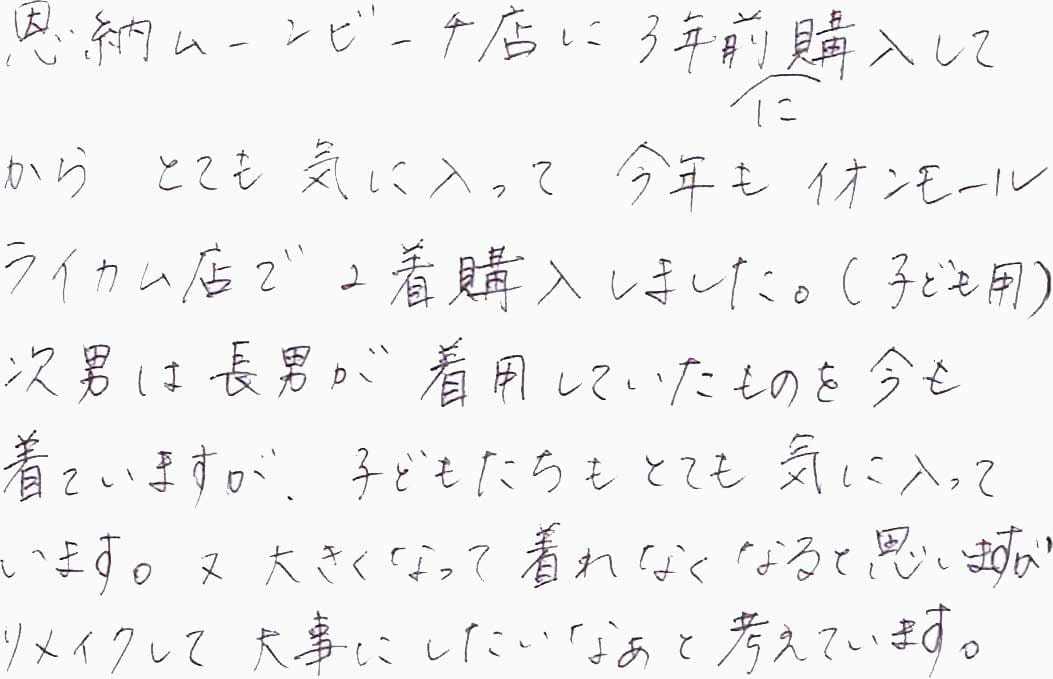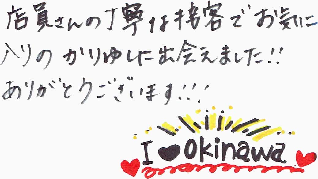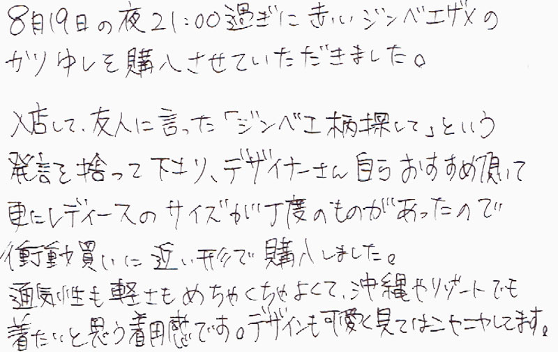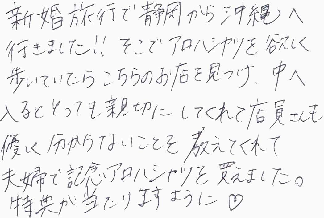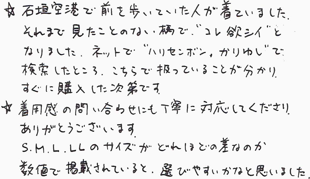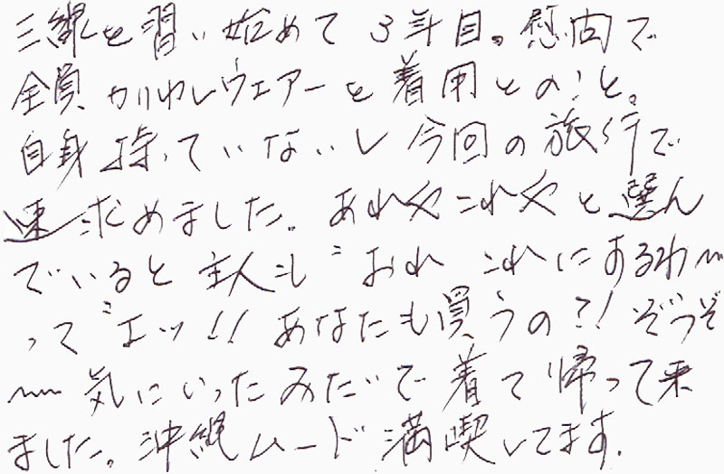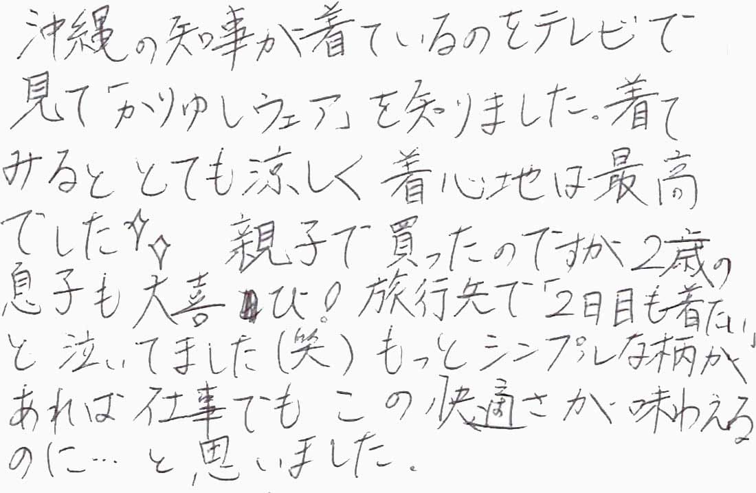 毎年、沖縄旅行を楽しみで、主人はいつも以前購入した御社のシャツを嬉しそうに着ているのを見て、今回こそは私の分のシャツを購入してもらいました!!女性らしいデザインのフレンチスリーブの袖に素敵な柄でとても気に入ってます。スタッフの方もとても親切に色々と提案して下さりまた沖縄に来た際は来店します!!ありがとうございました。