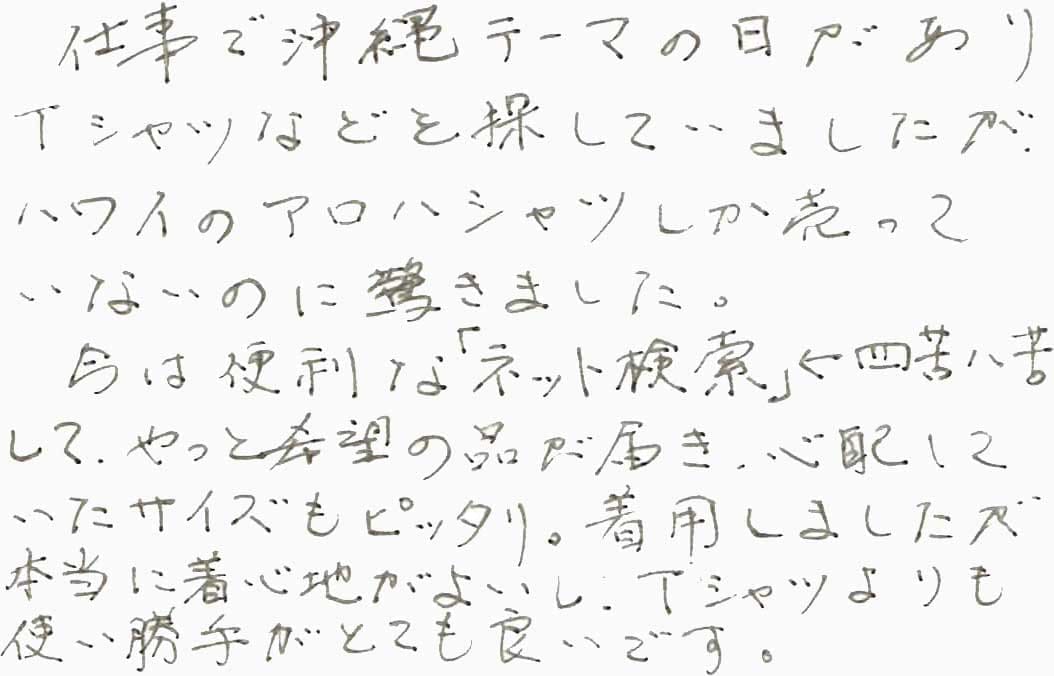 仕事で沖縄テーマの日があり、Tシャツなどを探していましたが、ハワイのアロハシャツしか売っていないのに驚きました。今は便利な「ネット検索」←四苦八苦して、やっと希望の品が届き、心配していたサイズもピッタリ。着用しましたが、本当に着心地もよいし、Tシャツよりも使い勝手がとても良いです。