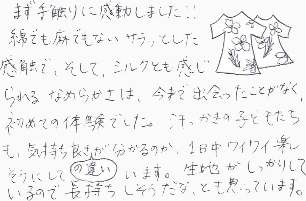 まず手触りに感動しました!!綿でも麻でもないサラッとした感触で、そして、シルクとも感じられるなめらかさは、今まで出会ったことがなく、初めての体験でした。汗っかきの子どもたちも、気持ち良さの違いが分かるのか、1日中ワイワイ楽しそうにしています。生地がしっかりしているので長持ちしそうだな、とも思っています。