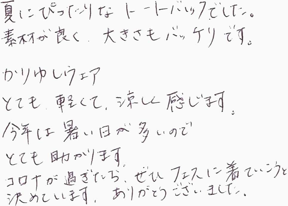 夏にぴったりなトートバックでした。素材が良く、大きさもバッチリです。かりゆしウェア、とても、軽くて、涼しく感じます。今年は暑い日が多いので、とても助かります。コロナが過ぎたら、ぜひフェスに着ていこうと決めています。ありがとうございます。