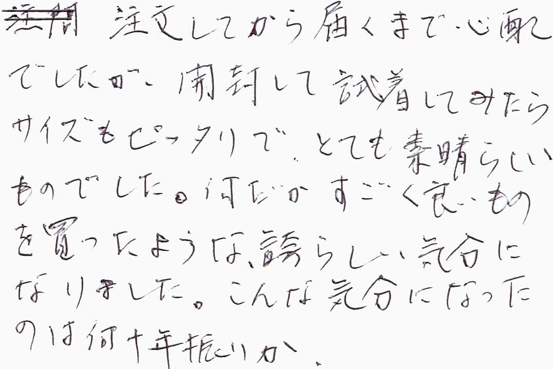 注文してから届くまで心配でしたが、開封して試着してみたらサイズもピッタリで、とても素晴らしいものでした。何だかすごく良いものを買ったような、誇らしい気分になりました。こんな気分になったのは何十年振りか。
