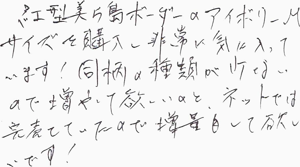紅型美ら島ボーダーのアイボリーMサイズを購入し非常に気に入っています!同柄の種類が少ないので増やして欲しいのと、ネットでは完売していたので増量もして欲しいです!