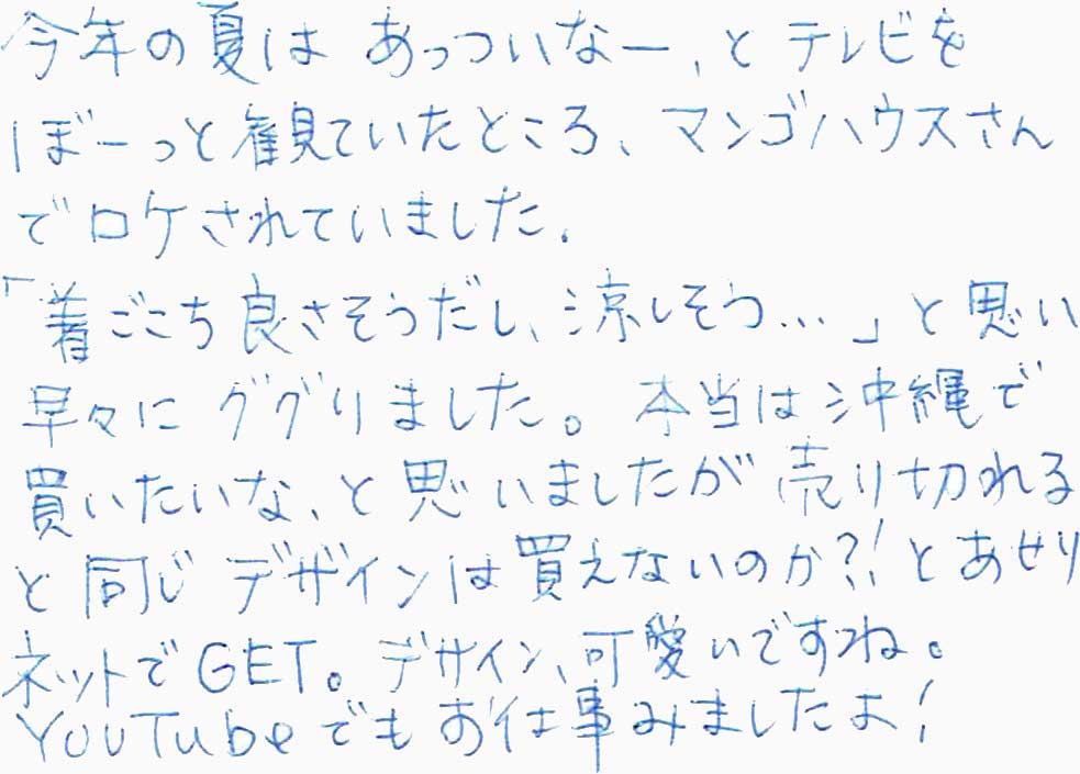 今年の夏はあっついなー、とテレビをぼーっと観ていたところ、マンゴハウスさんでロケされていました。「着ごこち良さそうだし、涼しそう…」と思い、早々にググりました。本当は沖縄で買いたいな、と思いましたが売り切れると同じデザインは買えないのか?!とあせりネットでGET。デザイン、可愛いですね。YouTubeでもお仕事みましたよ!