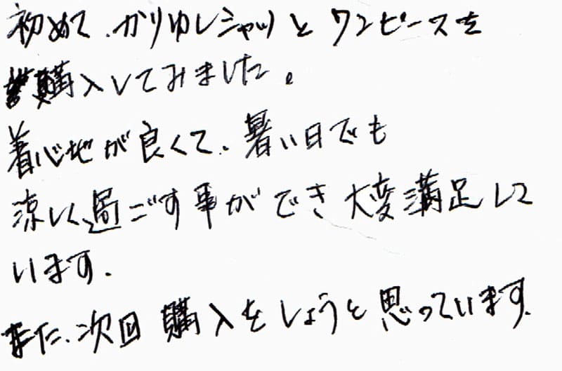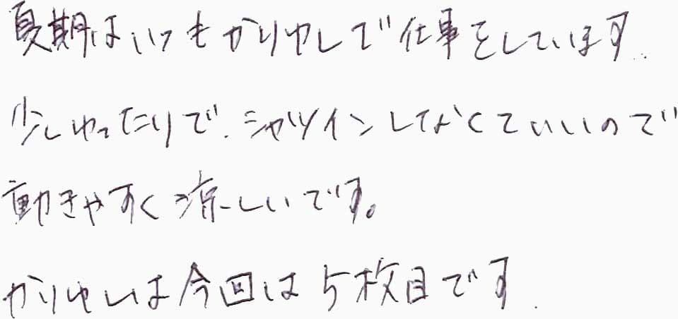 - 自分は綿の生地が好きなのでとても涼しく着られています。