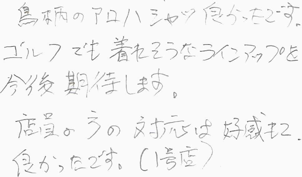 鳥柄のアロハシャツ良かったです。ゴルフでも着れそうなラインアップを今後期待します。店員の方の対応は好感もて良かったです。(1号店)