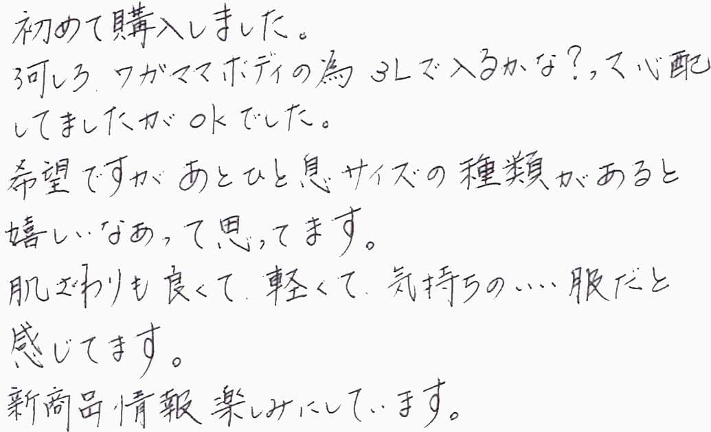 初めて購入しました。何しろ、ワガママボディの為3Lで入るかな?って心配してましたがOKでした。希望ですがあとひと息サイズの種類があると嬉しいなあって思ってます。肌ざわりも良くて、軽くて、気持ちのいい服だと感じてます。新商品情報楽しみにしています。