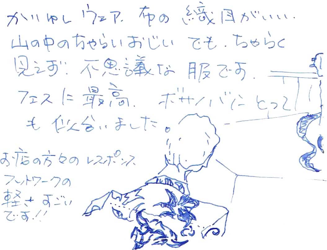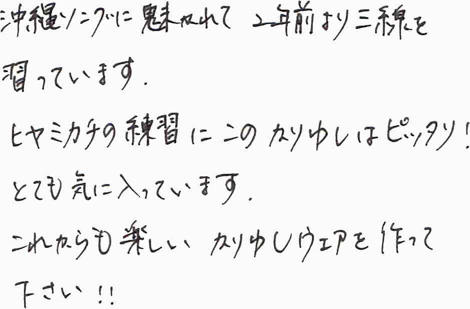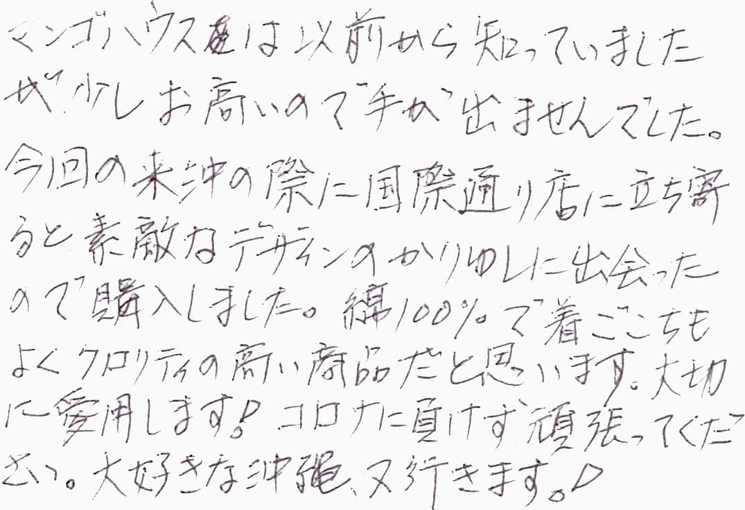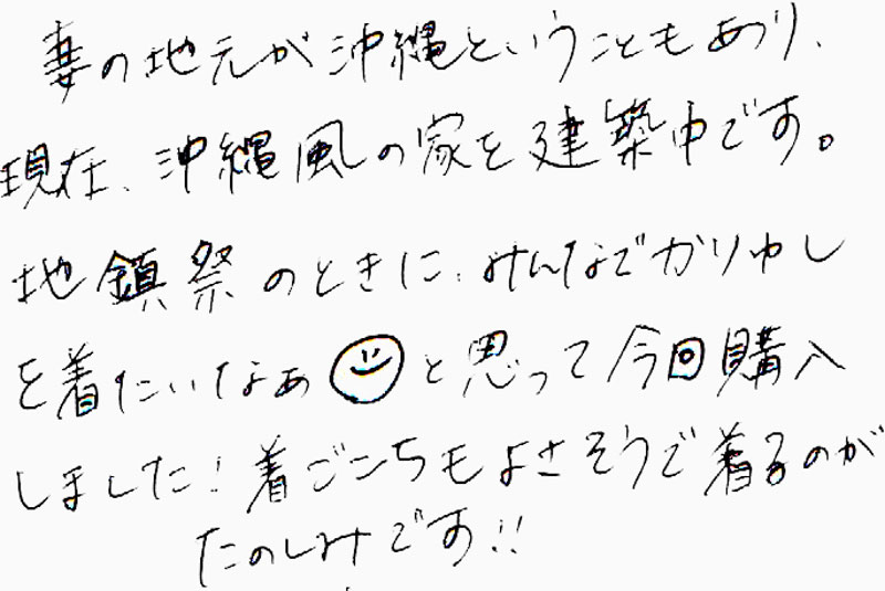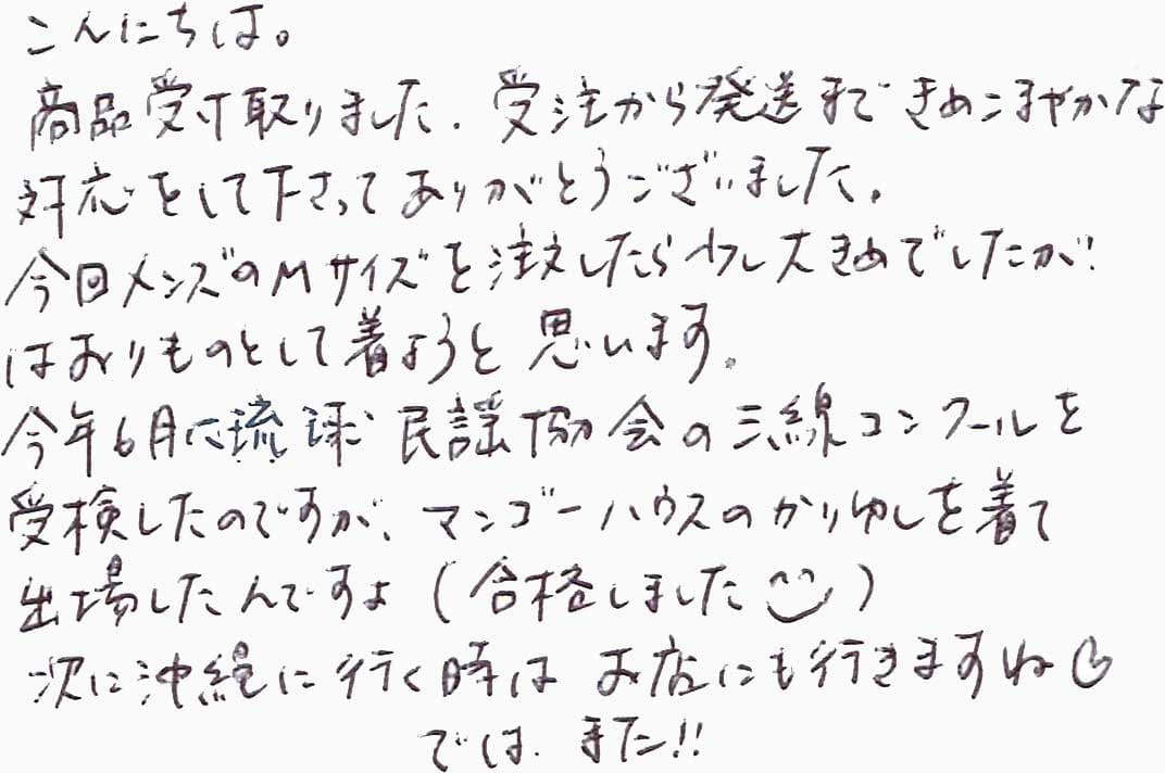 こんにちは。商品受け取りました。受注から発送まできめこまやかな対応をして下さってありがとうございました。今回メンズのMサイズを注文したら少し大きめでしたが、はおりものとして着ようと思います。今年6月に琉球民謡協会の三線コンクールを受検したのですが、マンゴーハウスのかりゆしを着て出場したんですよ(合格しました)次に沖縄に行く時はお店にも行きますね。では、また!!