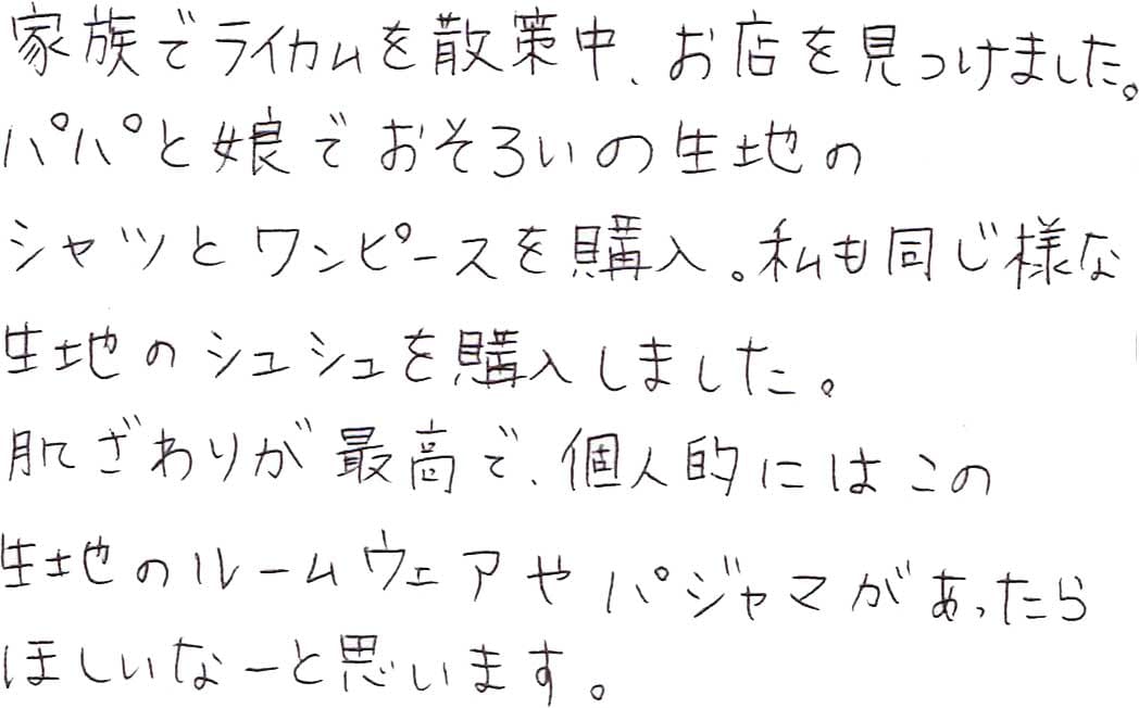 家族でライカムを散策中、お店を見つけました。パパと娘でおそろいの生地のシャツとワンピースを購入。私も同じ様な生地のシュシュを購入しました。肌ざわりが最高で、個人的にはこの生地のルームウェアやパジャマがあったらほしいなーと思います。