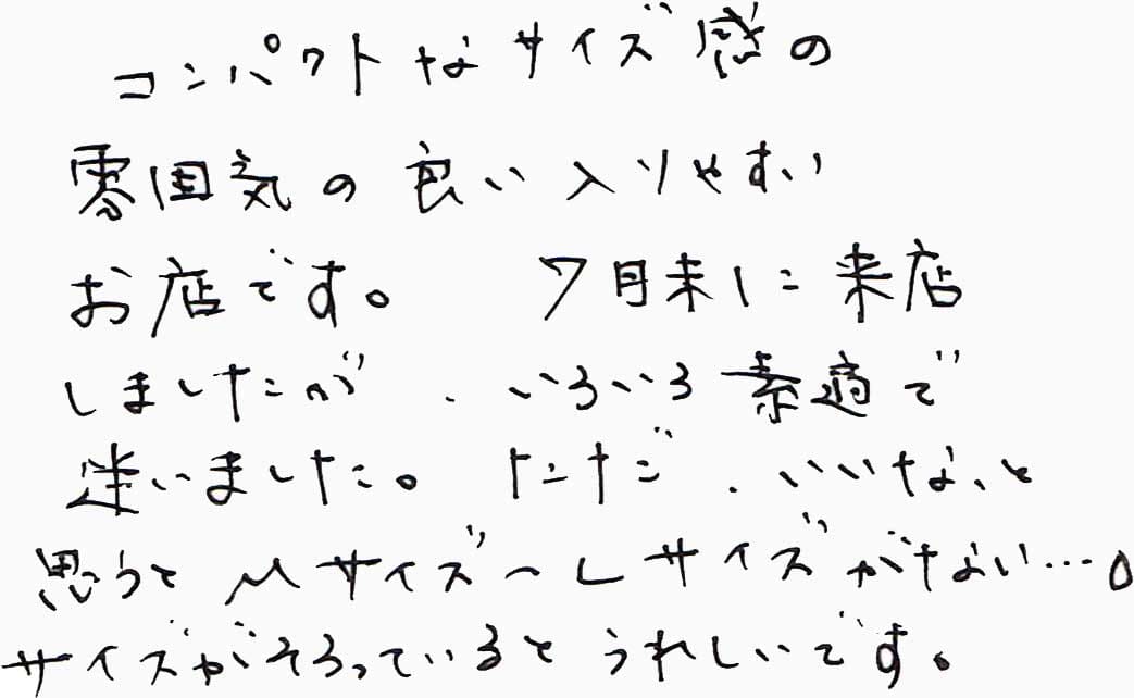 コンパクトなサイズ感の雰囲気の良い入りやすいお店です。7月末に来店しましたが、いろいろ素適で迷いました。ただ、いいな、と思うとMサイズ~Lサイズがない…。サイズがそろっているとうれしいです。